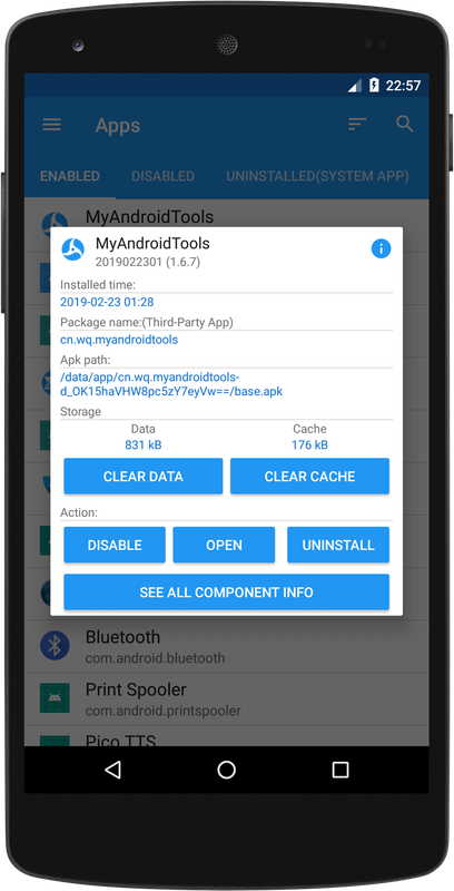 Display the app detail (Including package name,apk file path,install/update time,manifest detail). You can disable or uninstall any app.